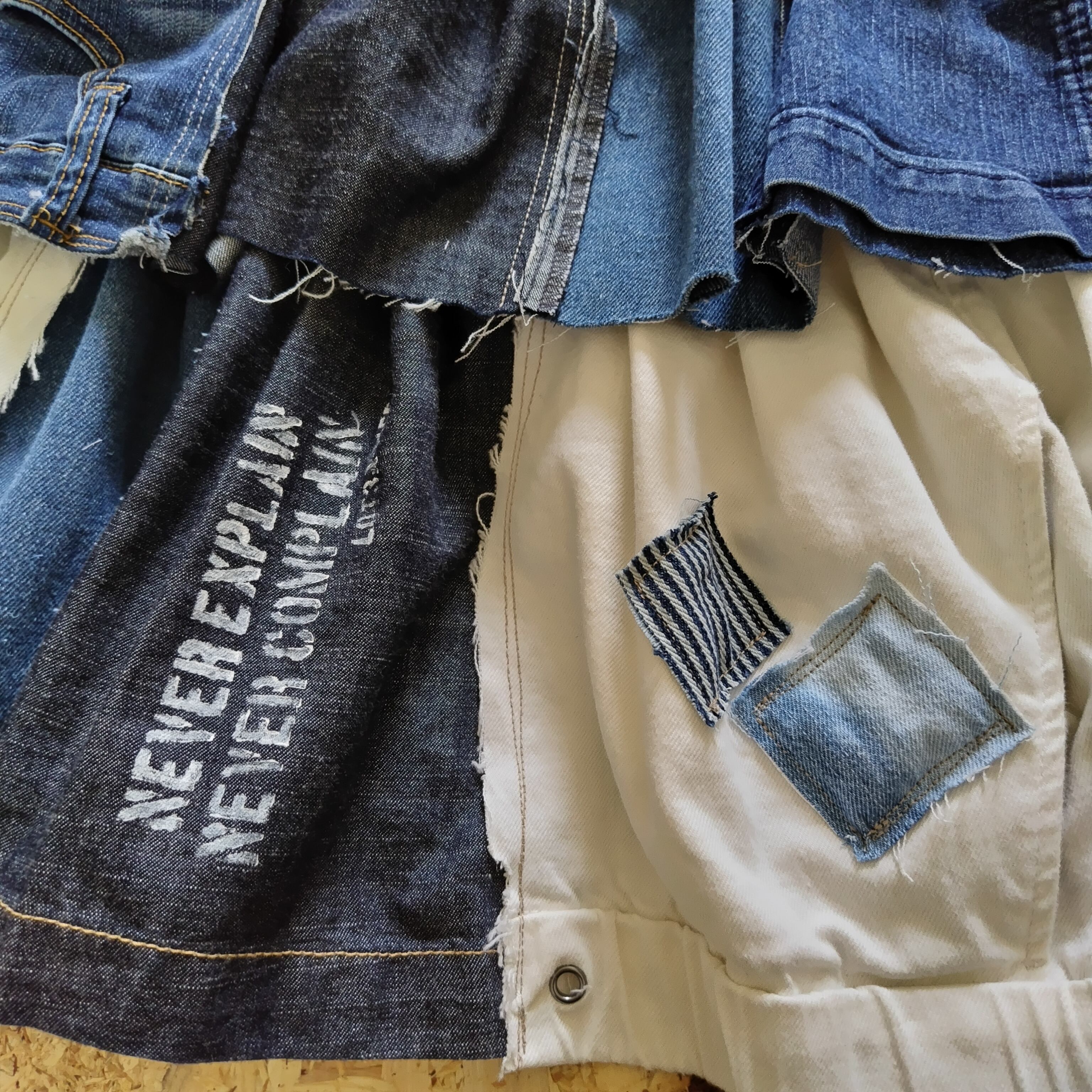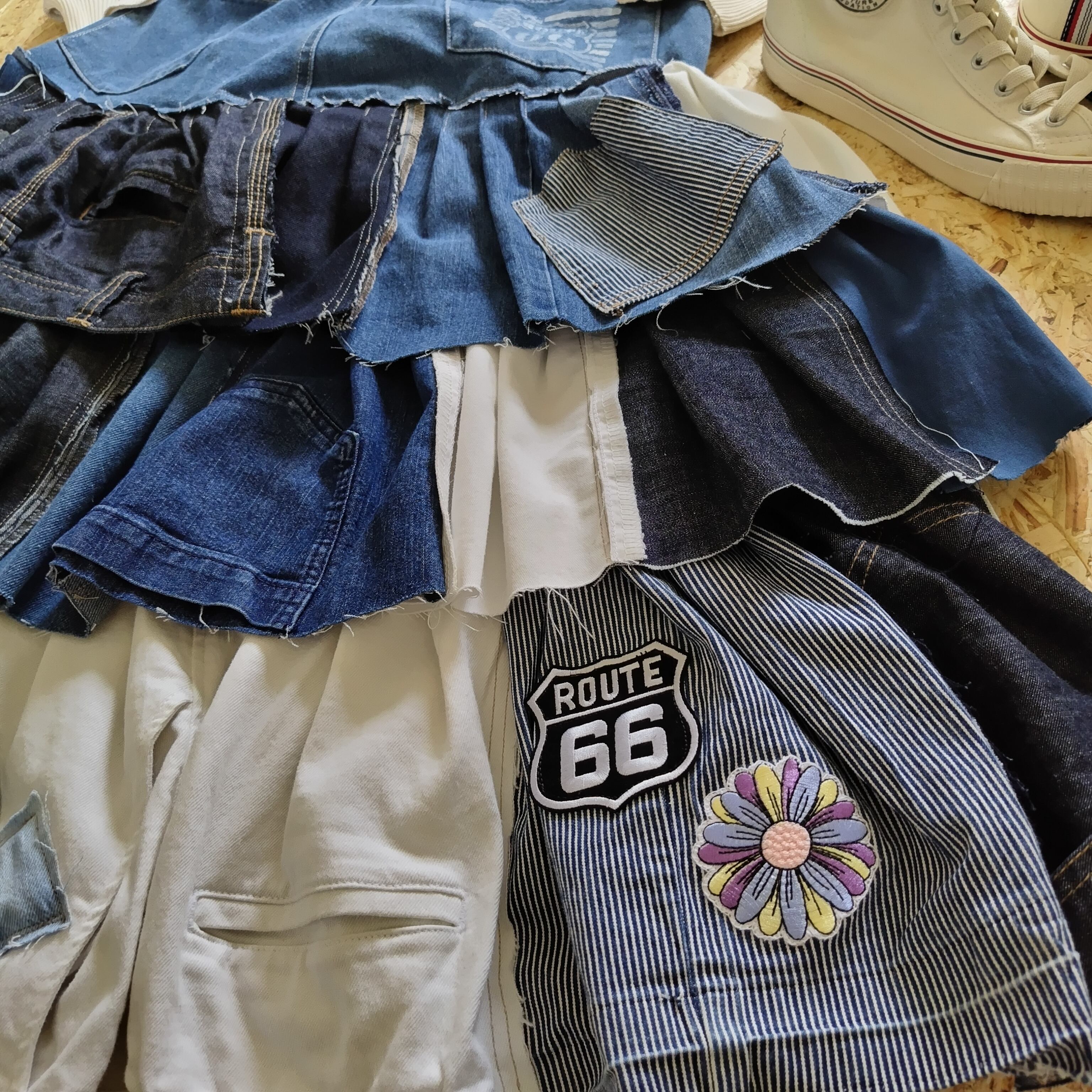 パッチワークの生地が織りなす独特な表情は、どの角度から見ても新鮮です。このスカートは、シンプルなトップスやカジュアルなブラウスと相性抜群で、デイリースタイルから特別なお出かけのコーディネートまで、幅広く活躍します(*ˊ˘ˋ*)。♪:*°