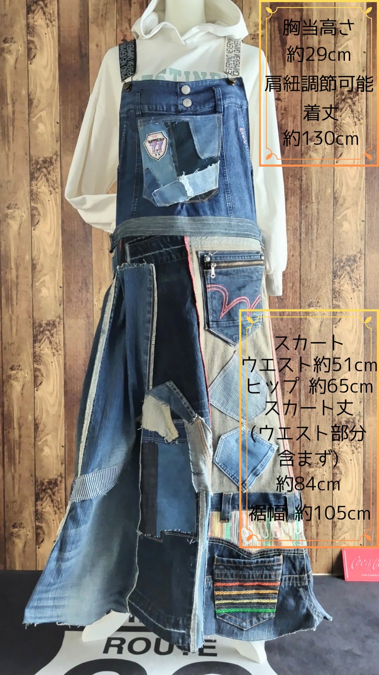 このパッチワークサロペットスカートは、異なるアウターや小物とのコーディネートを楽しむことができます。肩紐やポケットのデザインがアクセントとなり、オリジナルのスタイリングを求める方にぴったりです。重ね着や色使いを工夫することで、あなただけのファッションを楽しむことができます!