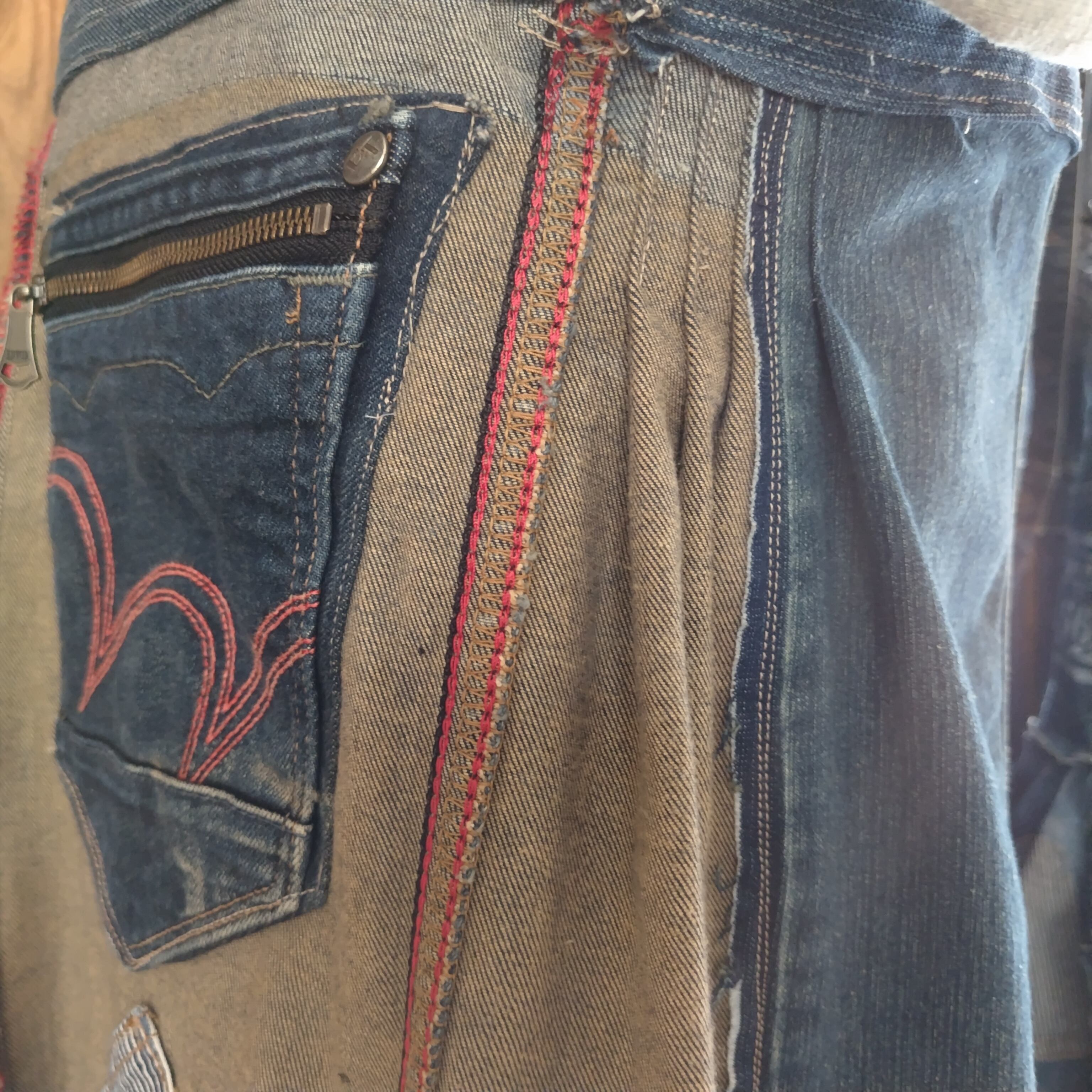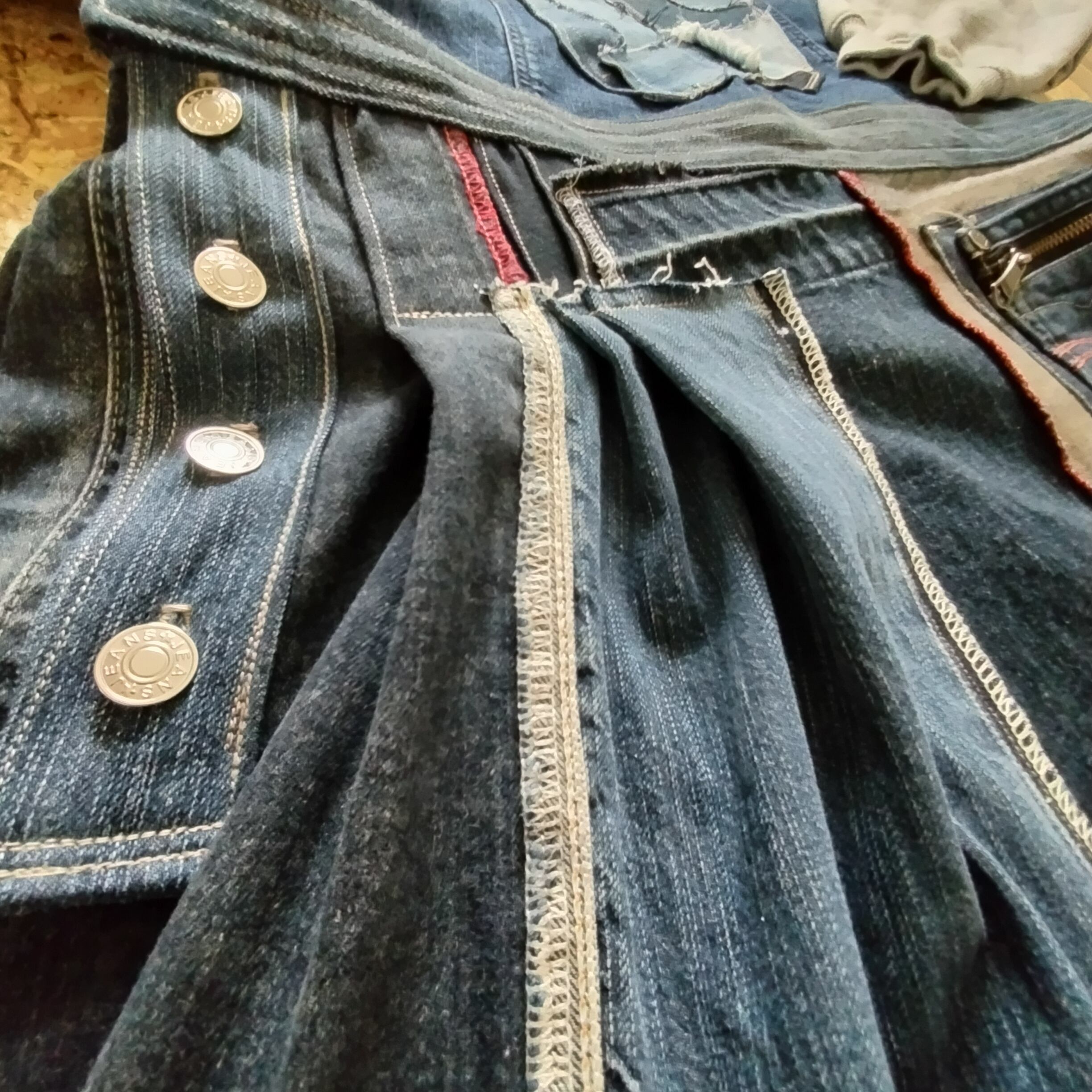 このパッチワークサロペットスカートは、左右で異なる色の肩紐と背当てが個性的で、ランダムに配置されたパッチワークが独自のスタイルを演出します。赤色のポイントがアクセントとなり、シンプルながらも目を引く仕上がりです。メンズライクなポケットが付いているため、機能性も兼ね備えています!